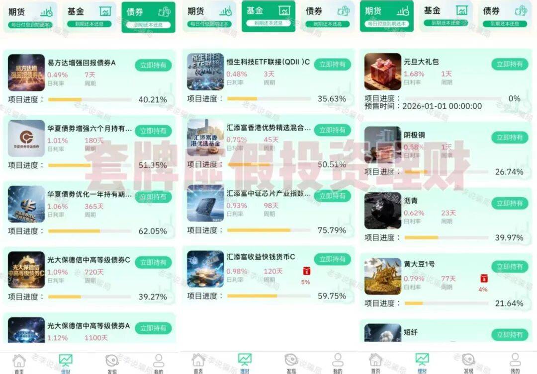 盗用正规企业信息,兜售虚假期货、基金、债券理财产品,并承诺高额回报。如此高额的回报率违背金融投资基本逻辑,正规期货、基金投资均存在风险,不可能实现固定高额收益。