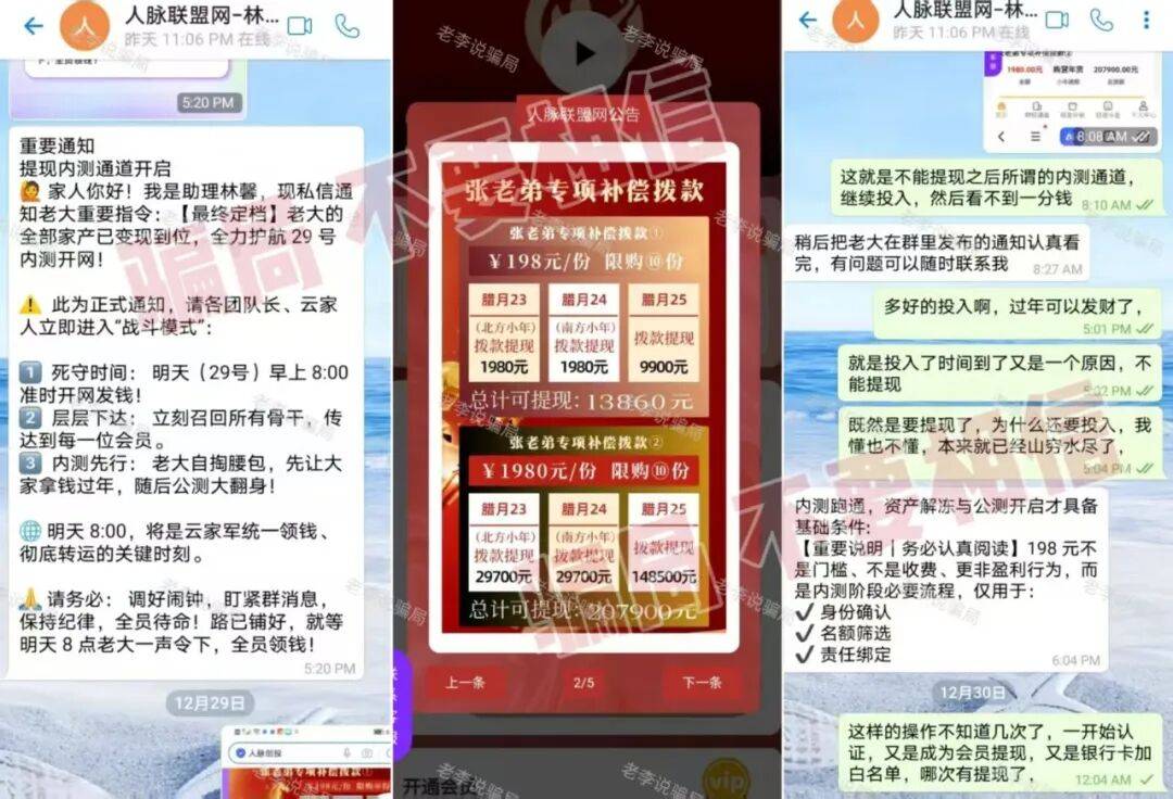 先是以赠送“基金”为名,收集用户个人信息。近期宣称19日可办理提现,诱导参与者缴纳298元核验费。收割风险极高,请尽快止损。