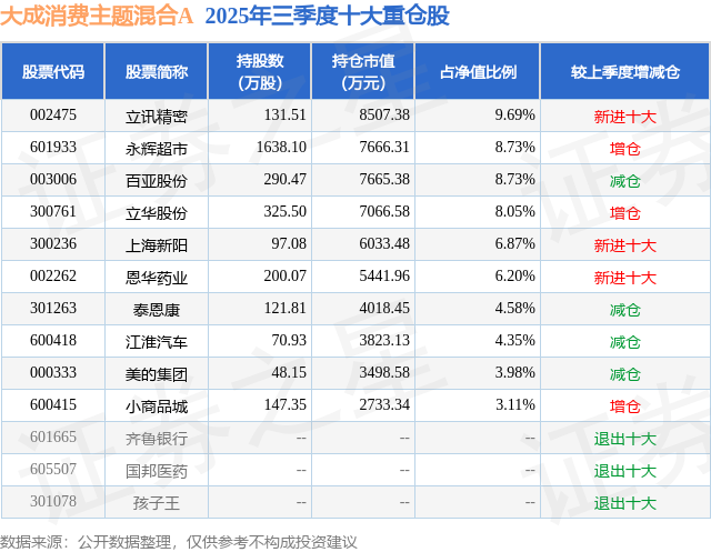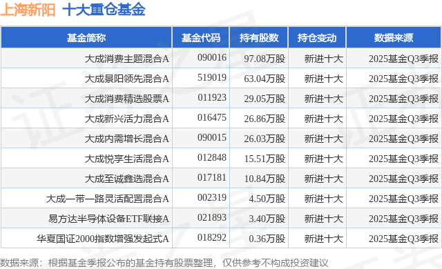 根据2025基金Q3季报公募基金重仓股数据,重仓该股的公募基金共10家,其中持有数量最多的公募基金为大成基金的大成消费主题混合A。大成消费主题混合A目前规模为7.74亿元,最新净值2.0668(12月31日),较上一交易日上涨0.12%,近一年上涨6.57%。该公募基金现任基金经理为齐炜中。齐炜中在任的基金产品包括:大成景阳领先混合A,管理时间为2020年2月3日至今,期间收益率为102.18%;大成一带一路灵活配置混合A,管理时间为2021年3月17日至今,期间收益率为27.61%;大成蓝筹稳健混合A,管理时间为2021年6月21日至今,期间收益率为-4.32%。