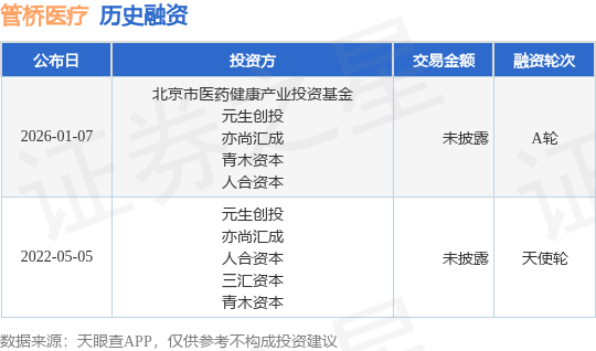 2026-01-10必威官方网站,Betway必威,必威APP下载证券之星消息,根据天眼查APP于1月7日公布的信息整理,北京管桥医疗科技有限公司A轮融资,融资额未披露,参与投资的机构包括北京市医药健康产业投资基金,元生创投,亦尚汇成,青木资本,人合资本。