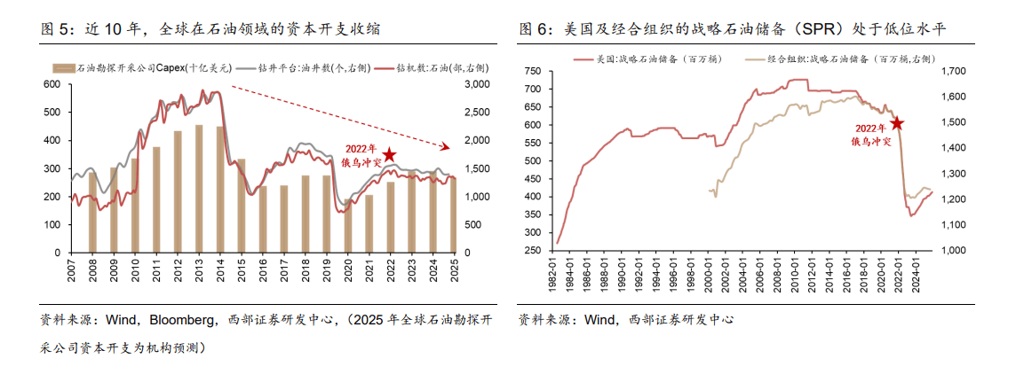 逻辑三:供需格局有望改善。库存端,原油市场正处库存历史低位。供给端,过去 10 年里,全球在石油供给端上的资本开支投入呈收缩趋势。