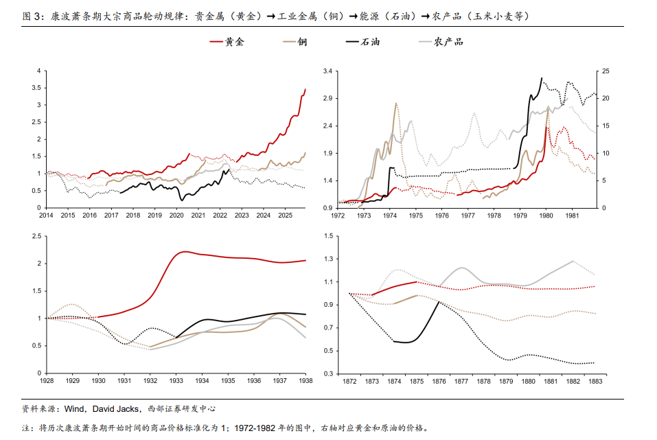 逻辑二:康波萧条期,按照商品周期的轮动规律,石油板块值得关注!康波萧条期,美元信用裂痕扩张,大宗商品的货币属性和安全属性得到增强,商品的超级周期启动!西部证券指出,商品超级周期并不代表商品价格同步共振,而是呈现出鲜明的“属性递进”式轮动,黄金率先上涨,工业金属(铜)紧随其后,能源(原油)上涨略微滞后,农产品往往最后上涨。能源(原油)在本轮商品超级周期中相对滞涨,后市值得重点关注。