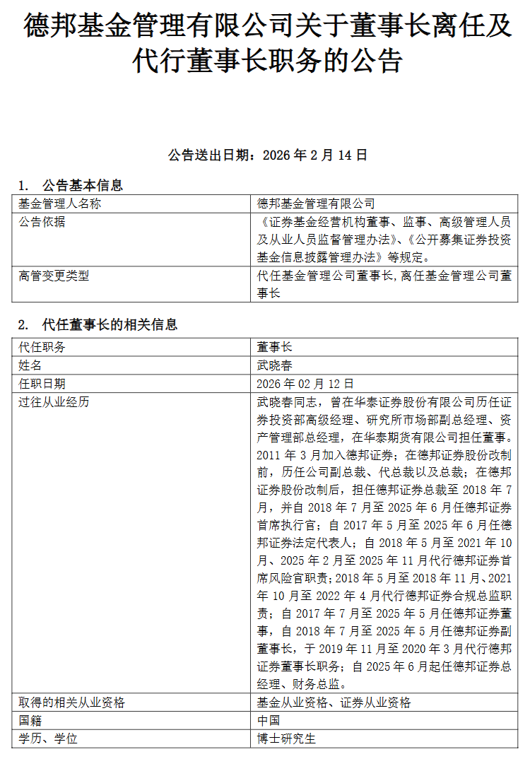 2026-02-24必威官方网站,Betway必威,必威APP下载2月14日,德邦基金发布董事长离任及代行董事长职务公告,经董事会审议,左畅因工作调整不再担任公司董事长,于2月12日离任,现任总经理武晓春已代行公司董事长职务。