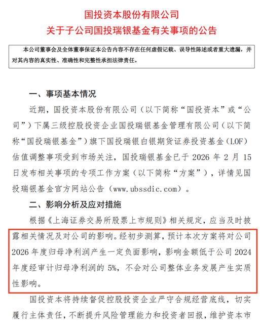 公告明确,国投瑞银基金的白银LOF补偿方案,预计对国投资本2026年度归母净利润产生的负面影响,不超过其2024年度经审计归母净利润的5%,也不会对该公司整体业务发展产生实质性影响。