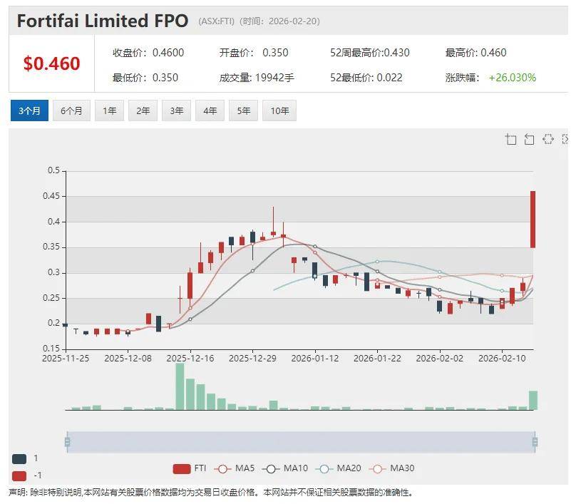 澳华财经在线数据库显示,FTI最新价0.46澳元,已发行股本3.03亿股,市值1.39亿澳元。