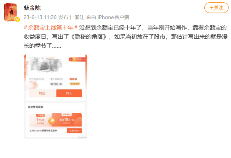 知名推理作家紫金陈曾经在微博上表示,在写作初期,正是靠着余额宝的收益度日,他才写出了日后脍炙人口的作品《隐秘的角落》。