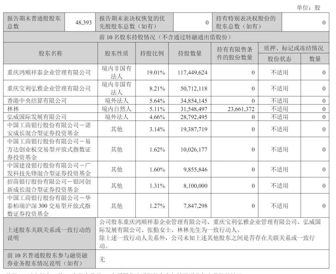 截至2025年6月30日,重庆鸿顺祥泰企业管理有限公司持股为19.01%,重庆宝利弘雅企业管理有限公司持股为8.21%,香港中央结算有限公司持股为5.64%,林林持股为5.11%,弘威国际发展有限公司持股为4.66%;