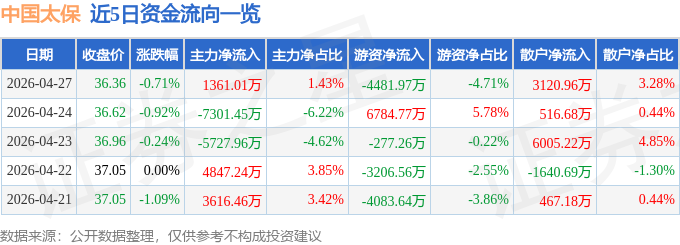2026-04-29必威官方网站,Betway必威,必威APP下载证券之星消息,截至2026年4月27日收盘,中国太保(601601)报收于36.36元,下跌0.71%,换手率0.38%,成交量26.07万手,成交额9.52亿元。