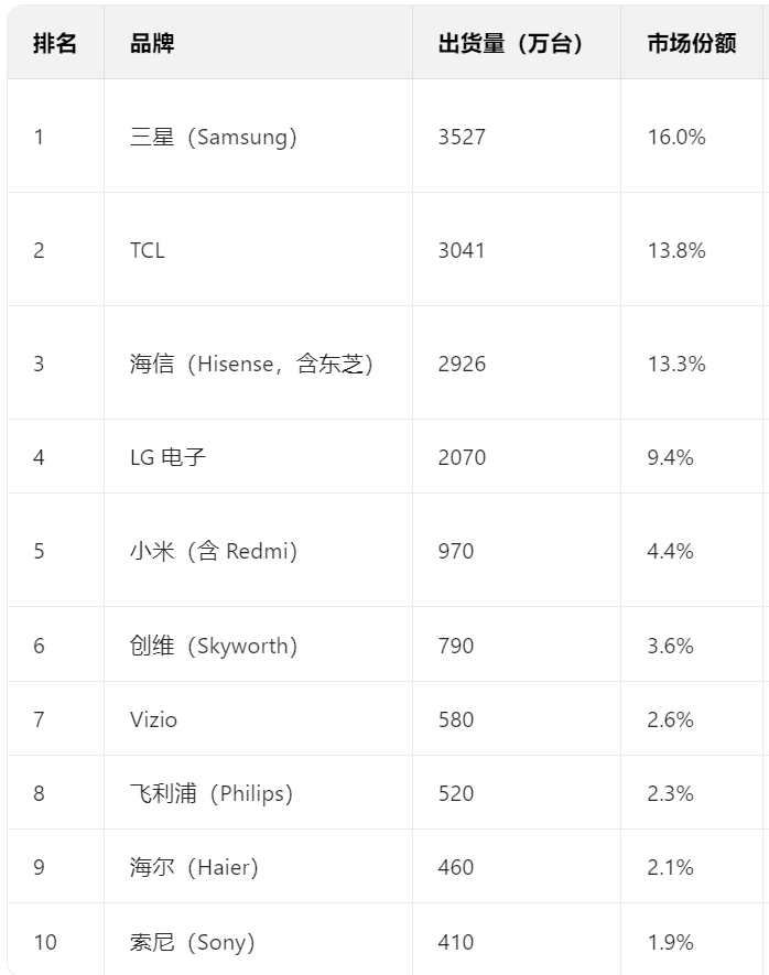根据Sigmaintell的数据,2025 年全球电视市场出货量约2.21亿台,其中主要品牌的市场占比如下:
