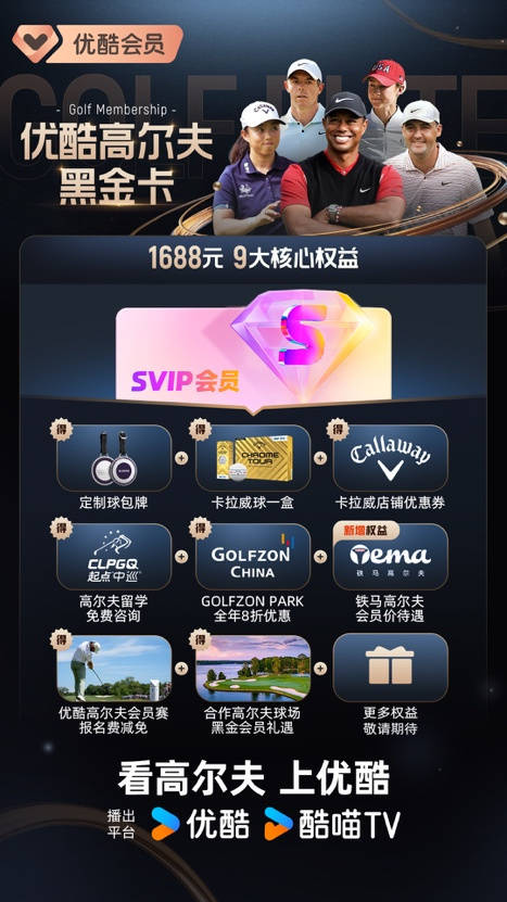 其中与多家业内知名品牌联名推出的“优酷高尔夫黑金卡”,整合优酷SVIP年卡会员、高尔夫尊运动公园打球八折优惠、2500元卡拉威天猫旗舰店优惠券、优酷高尔夫会员赛报名费减免、合作高尔夫球场黑金礼遇等八大权益,覆盖球友观赛、学球、练球、下场、装备入手等高尔夫生活的各个环节。线下会员邀请赛联动国内锦标赛级别高尔夫球场,带给会员顶级的线下打球体验,优酷体育由此开拓出从线上内容延伸到线验、从竞技欣赏延伸到个人实战的高尔夫受众互动空间,介入到高尔夫生态圈更深入的圈层,加强了对于活跃国内高球社区的贡献。