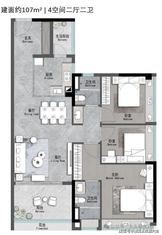 这款户型设计了4空间二厅二卫,布局紧凑合理。南向面宽大,采光充足。通过高赠送面积,实际使用空间远超107㎡,非常适合刚改家庭。